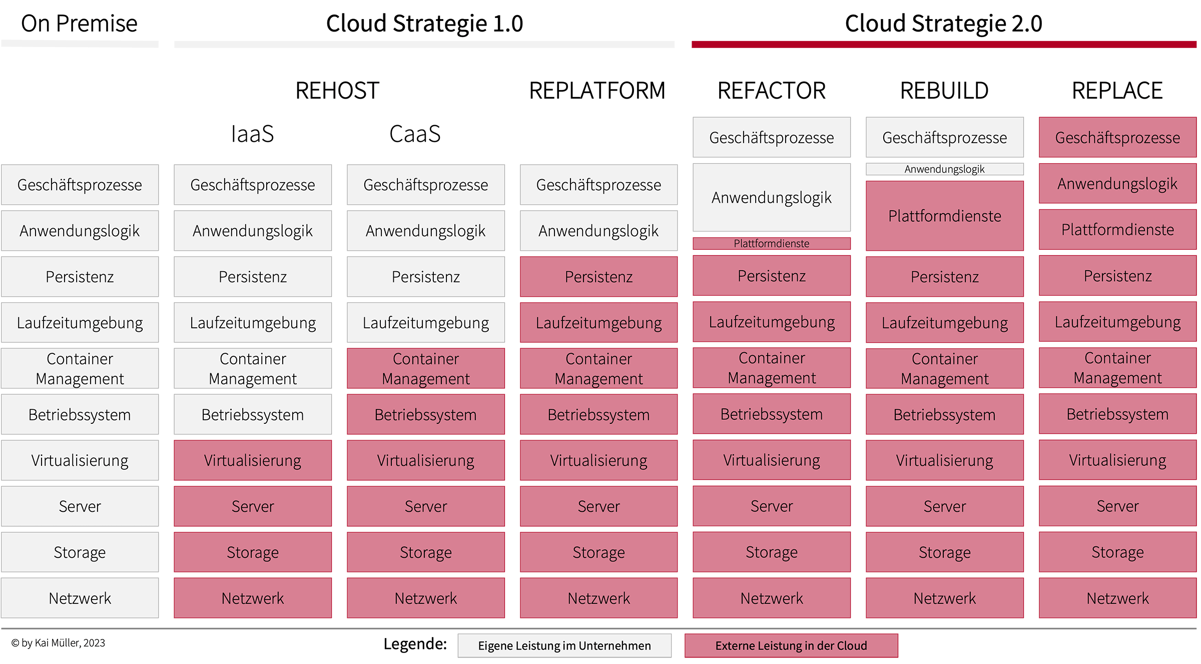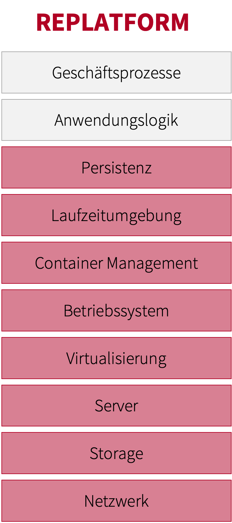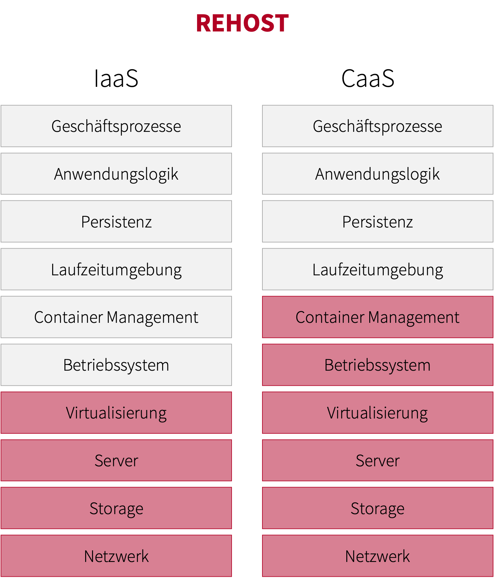 REHOST, auch Lift & Shift genannt: Verlagert eine Anwendung auf möglichst einfache Weise in eine Cloud, indem die Anwendung statt auf lokalen (virtuellen) Maschinen auf kompatiblen Maschinen in der Cloud ausgeführt wird. Wurde früher bevorzugt als Strategie zur Bereitstellung auf virtuellen Maschinen (Infrastructure as a Service: IaaS) verwendet. Wird heute aber auch verwendet, um Container-Plattformen zu nutzen (Container as a Service: CaaS).