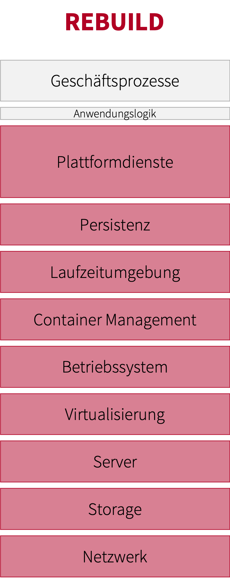 REBUILD ist der große Bruder von REFACTOR. Er beschreibt die komplette Neuentwicklung einer Anwendung auf Basis von Cloud-Technologien. Dabei werden Plattformdienste intensiv genutzt, was eine intensive Auseinandersetzung mit den Aspekten des Vendor Lock-Ins erfordert. Die Schicht der selbst entwickelten Anwendungslogik wird auf ein Minimum reduziert. Lediglich die Geschäftsprozesse verbleiben vollständig in der Verantwortung der Eigenentwicklung im Unternehmen.