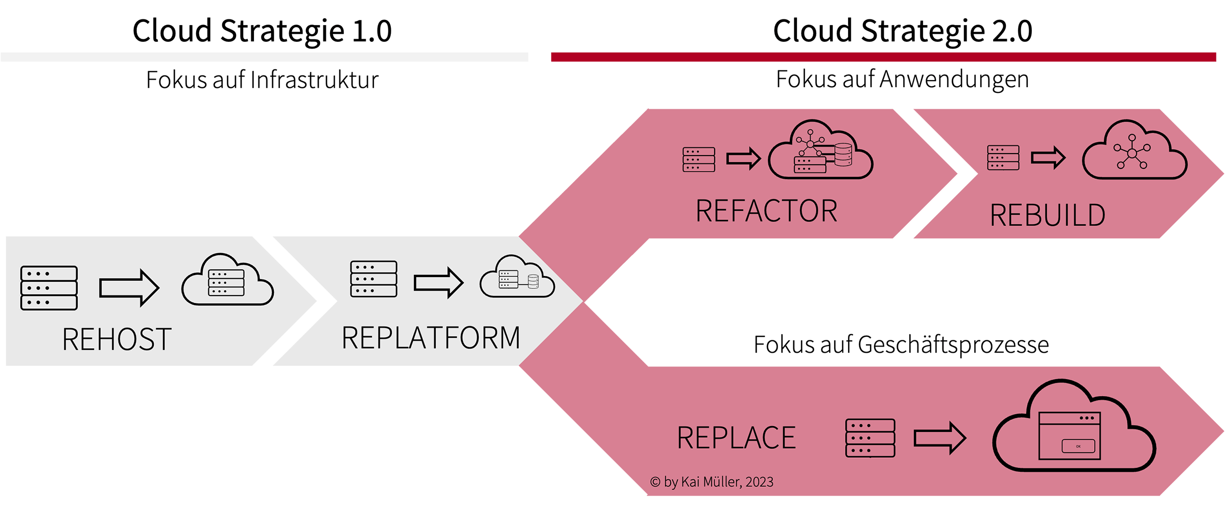 Als Cloud-Strategie 2.0 bezeichne ich die Transformationsmodelle REFACTOR, REBUILD und REPLACE, die sich vor allem auf den Lebenszyklus von Anwendungen und Geschäftsprozessen beziehen. In diesem Sinne ist die Cloud-Strategie 2.0 gleichzeitig eine Strategie für den Lebenszyklus einer Anwendung und fällt auch in die Zuständigkeit des Application Life-Cycle Managements.