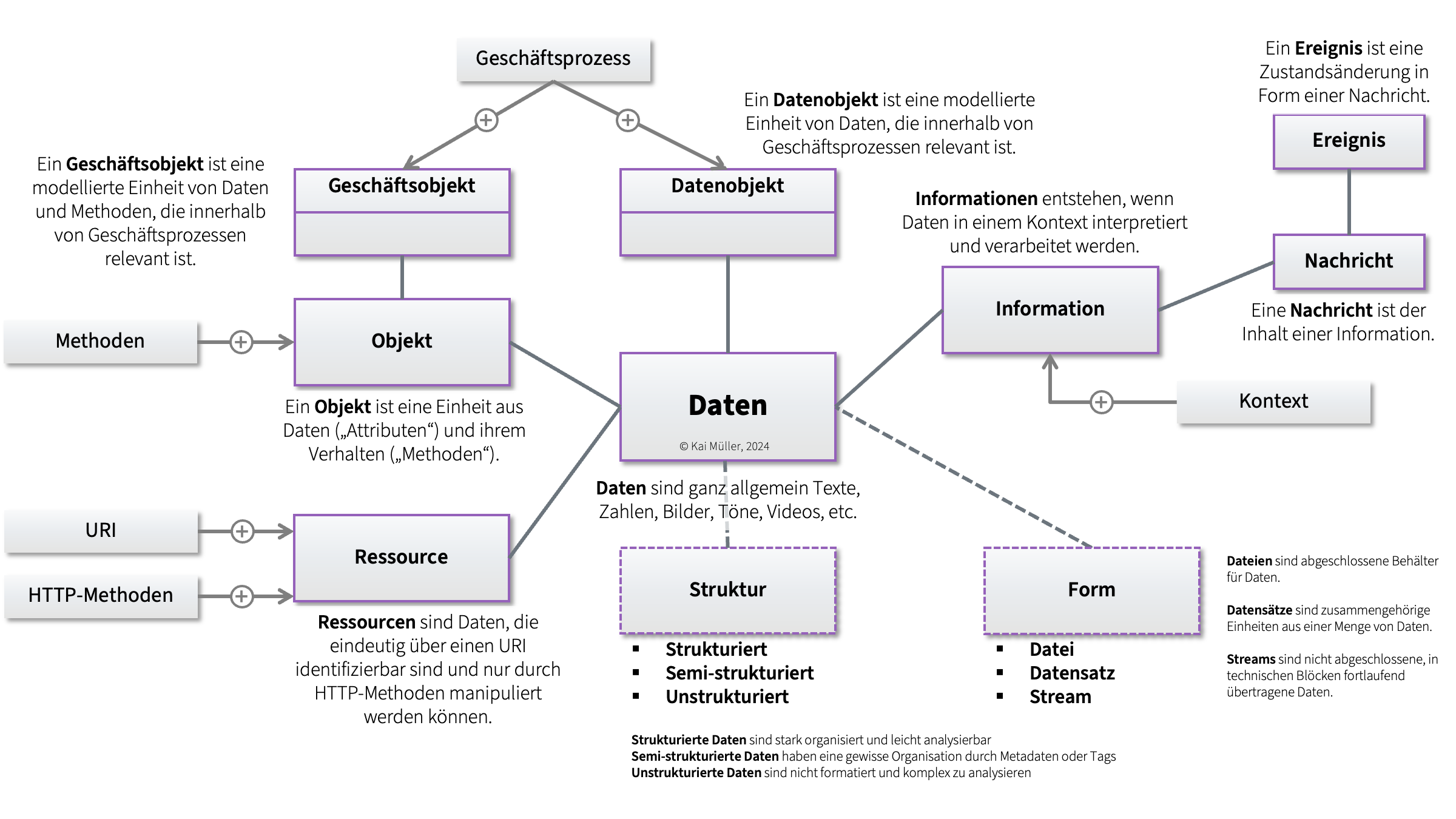 Daten sind die grundlegendsten Einheiten, sie können zunächst alles sein, was in digitaler Form gespeichert werden kann: Zahlen, Texte, Bilder, Musik, Videos usw. Sie sind die Rohform von Informationen ohne Kontext, die noch nicht interpretiert oder verarbeitet wurden. Daten können in Form von Datensätzen, Dateien oder Streams (Datenströmen) auftauchen. Sie können stark strukturiert in Tabellen, semi-strukturiert im JSON- oder XML-Format oder unstrukturiert wie in Bildern und Videos vorliegen. In der IT-Landschaft eines Unternehmens geht es meist um die Verarbeitung und Übertragung von geschäftlichen Daten als Geschäfts- oder Datenobjekte wie in Kundenadressen, Rechnungen etc.