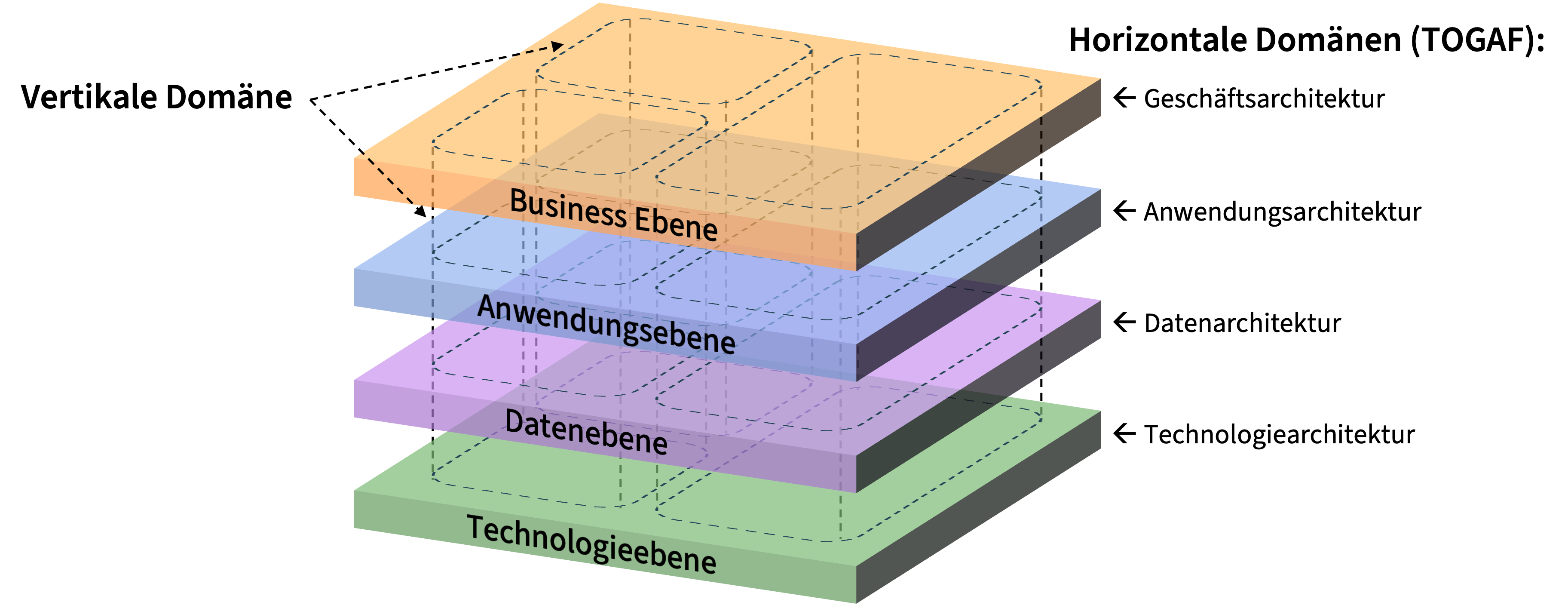 Der Begriff der Domäne ist mehrdeutig: TOGAF definiert das was ich hier auf der Website Ebenen der Enterprise Architektur nenne, als Domäne (siehe unten). Meiner Erfahrung nach wird das Wort Domäne im Unternehmensalltag jedoch eher für eine vertikale Domäne verwendet - im Gegensatz zur horizontalen Definition von TOGAF. Um dieser Verwechslung zu entgehen, verwende ich für die horizontalen Domänen das Wort Ebene.