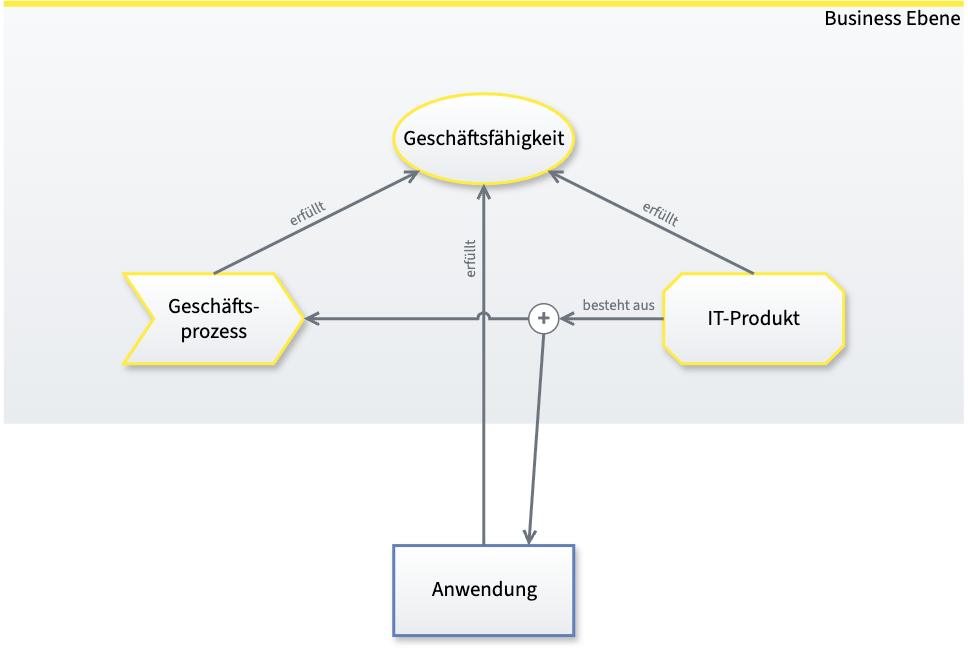 Im Metamodell besteht das IT-Produkt in jedem Fall aus mehreren Geschäftsprozessen und gegebenenfalls einer oder mehreren Anwendungen.