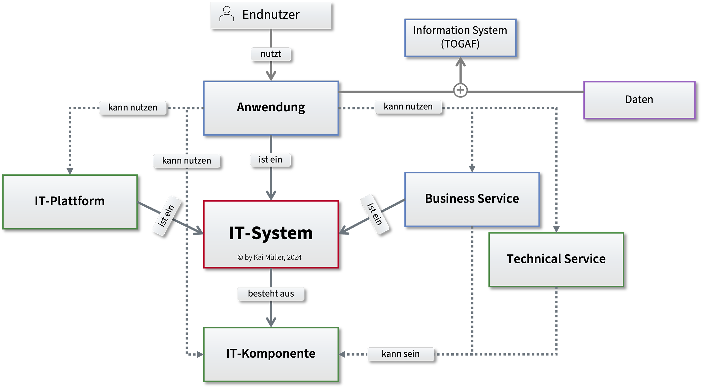 Ein IT-System ist ein umfassender Begriff, der die Gesamtheit von Hardware, Software und technischen Prozessen beschreibt, die zusammenwirken, um ein bestimmtes Ziel zu erreichen. In diesem Sinne ist er hier der Oberbegriff für alle folgenden Begriffe: Ein IT-System kann beispielsweise sowohl eine Anwendung als auch ein Service sein. IT-Systeme können sowohl physische als auch virtuelle Komponenten umfassen und sind häufig komplex. Sie umfassen die Integration verschiedener Technologien und Methoden zur Erfüllung ihrer Aufgaben.